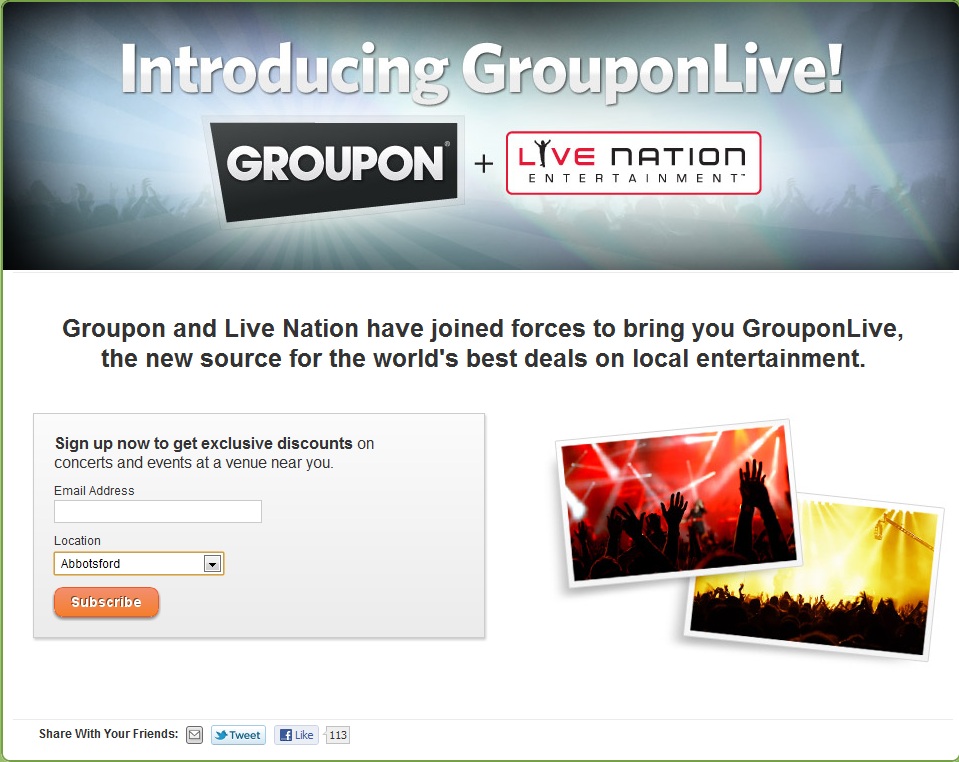 Live Nation and Groupon today rolled out GrouponLive. The site will act much like the main Groupon service, offering bargain pricing on a variety of events, targeted near where customers live. The service will begin offering deals at some point before the summer concert season.