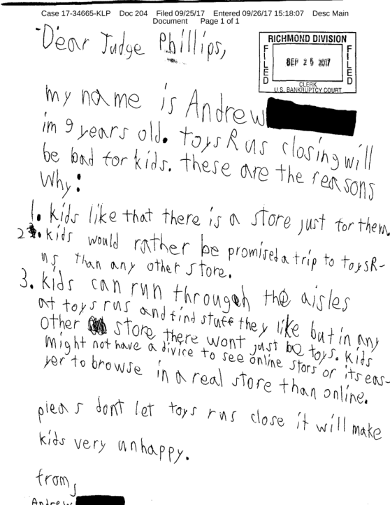 The letter, which was entered into the bankruptcy docket on Monday, is from a boy named Andrew (his last name was redacted). In it, he argues to the court that the closure of Toys ‘R’ Us would be “bad for kids,” backing up his claim with three pretty solid reasons.