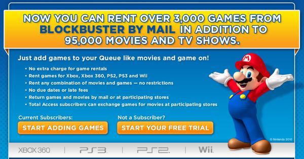 Starting immediately, customers of Blockbuster By Mail are able to rent video games for all the major console systems. The company says it has over 3,000 titles available. Netflix does not currently rent games.